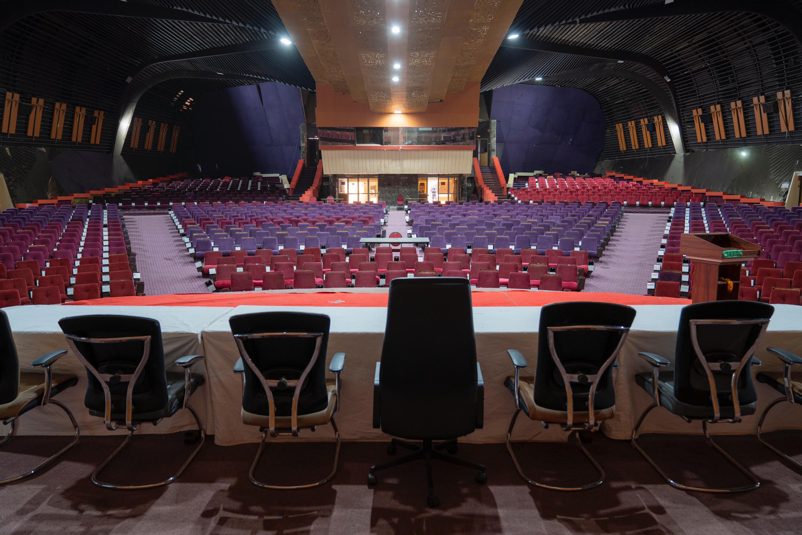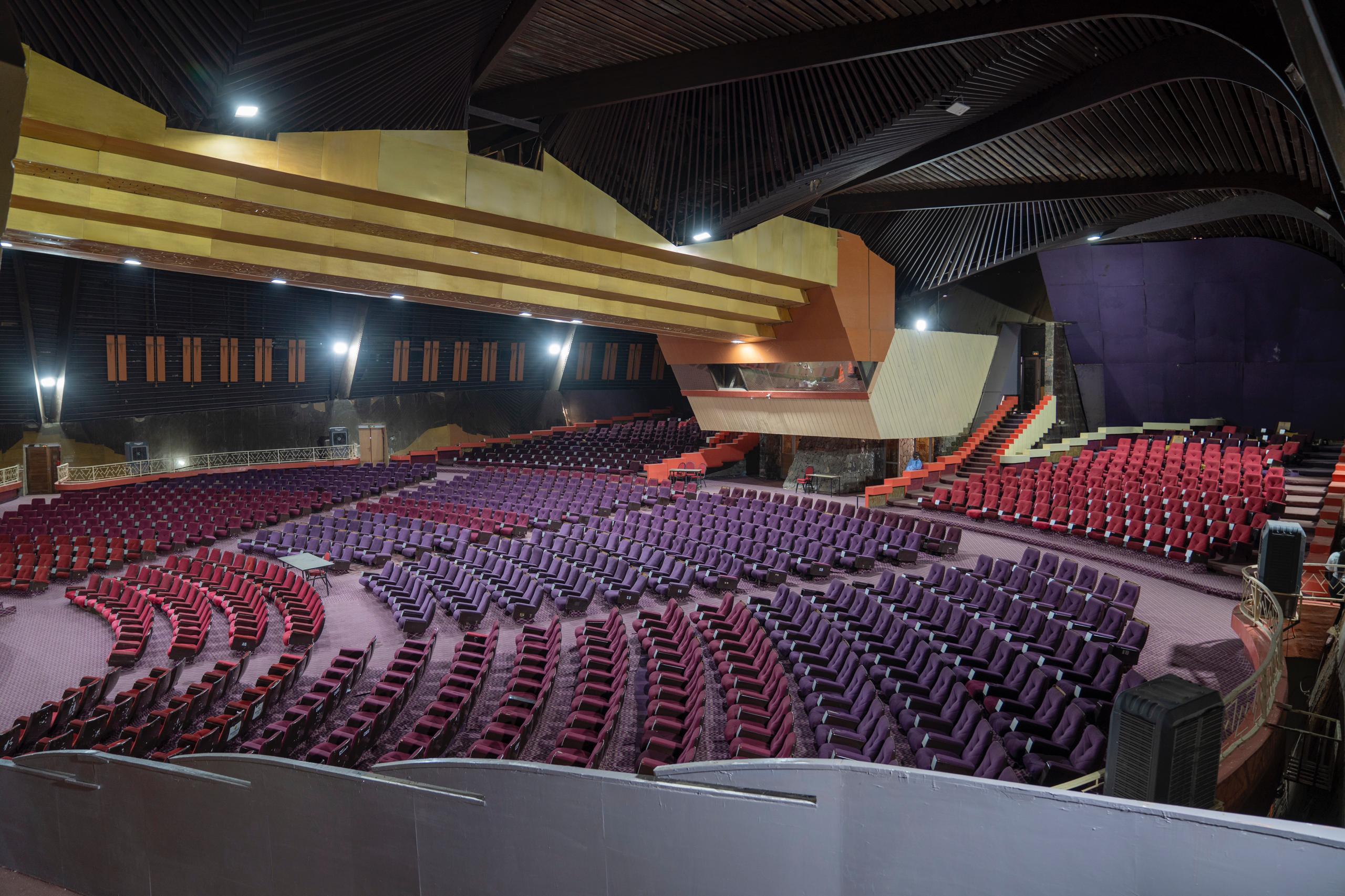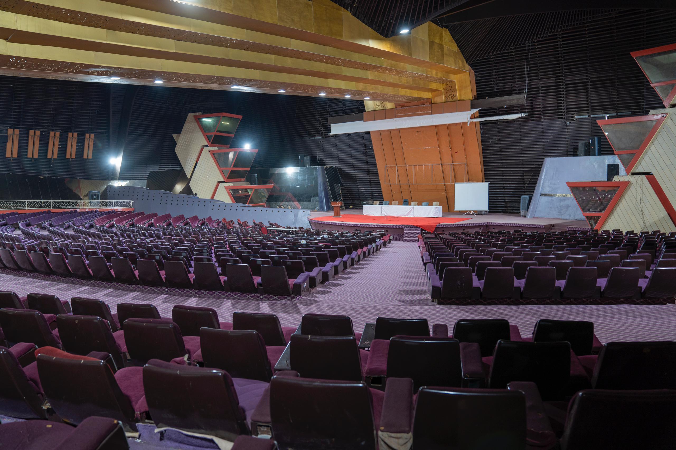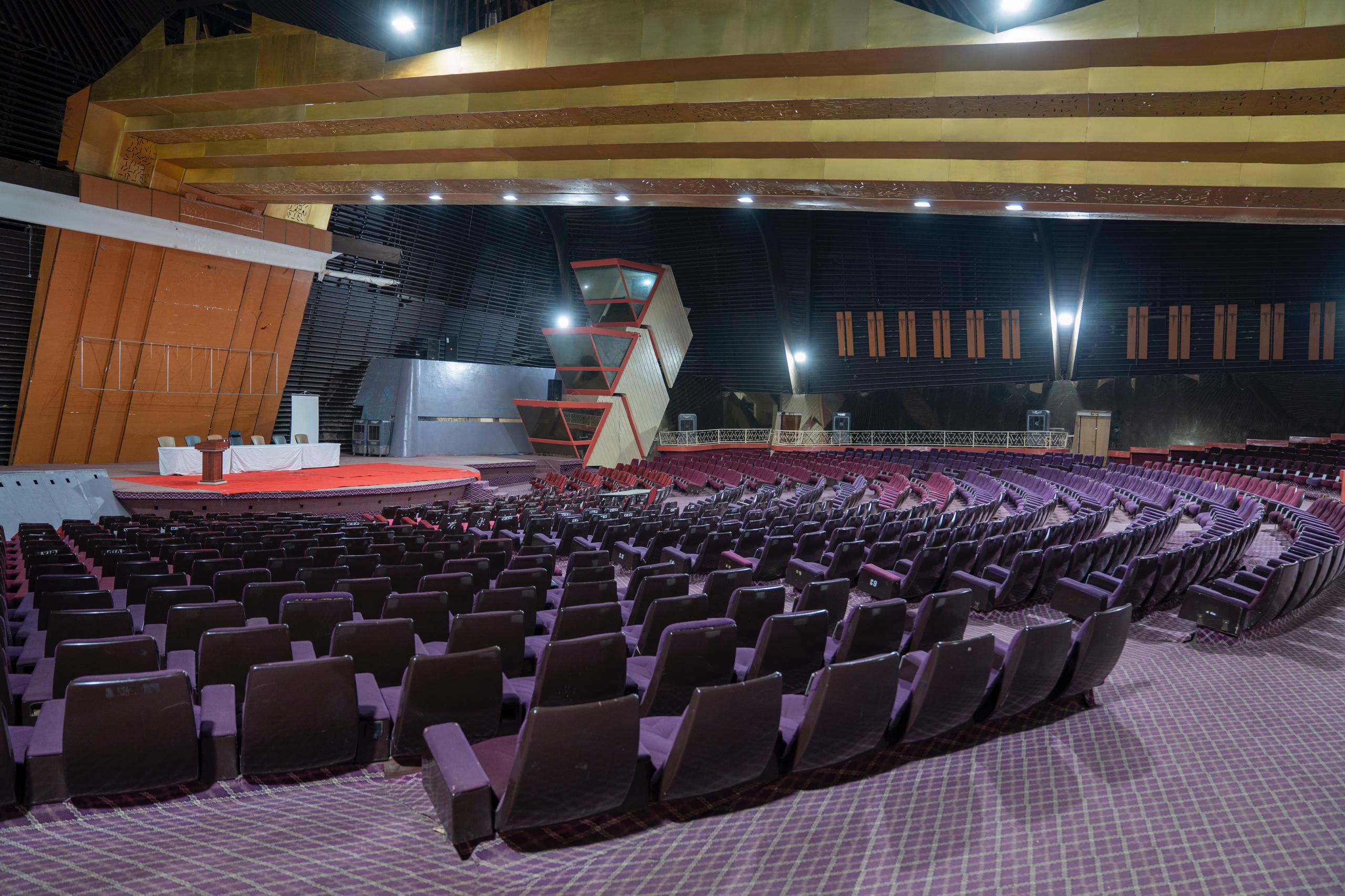 Auditorium de plus de 1.000 places doté d’un large podium, équipement de traduction simultanée (06 langues), matériel de sonorisation, loges artistes, écran de projection amovible, toilettes (loges et public).